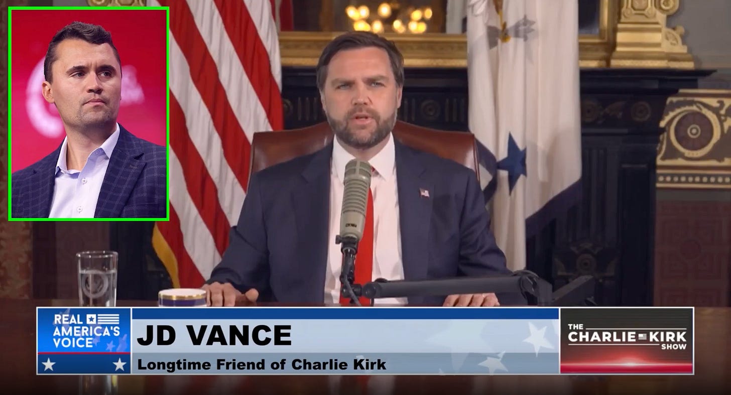Overton OriginalsRemembering Charlie Kirk With Vice President JD VanceMiller, Leavitt, Tucker, and RFK Jr. joined Vice President JD Vance on The Charlie Kirk Show to honor a friend taken too soon.OvertonSep 15, 2025∙ Paid93719ShareFor ALL of 30 days of September, yearly Subscriptions are 30% OFF! If you want to support the growth of the Overton network, the most powerful thing you can do is you can do is sign up to become a pa…SubscribeThis post is for paid subscribersSubscribeAlready a paid subscriber? Sign inPreviousNext