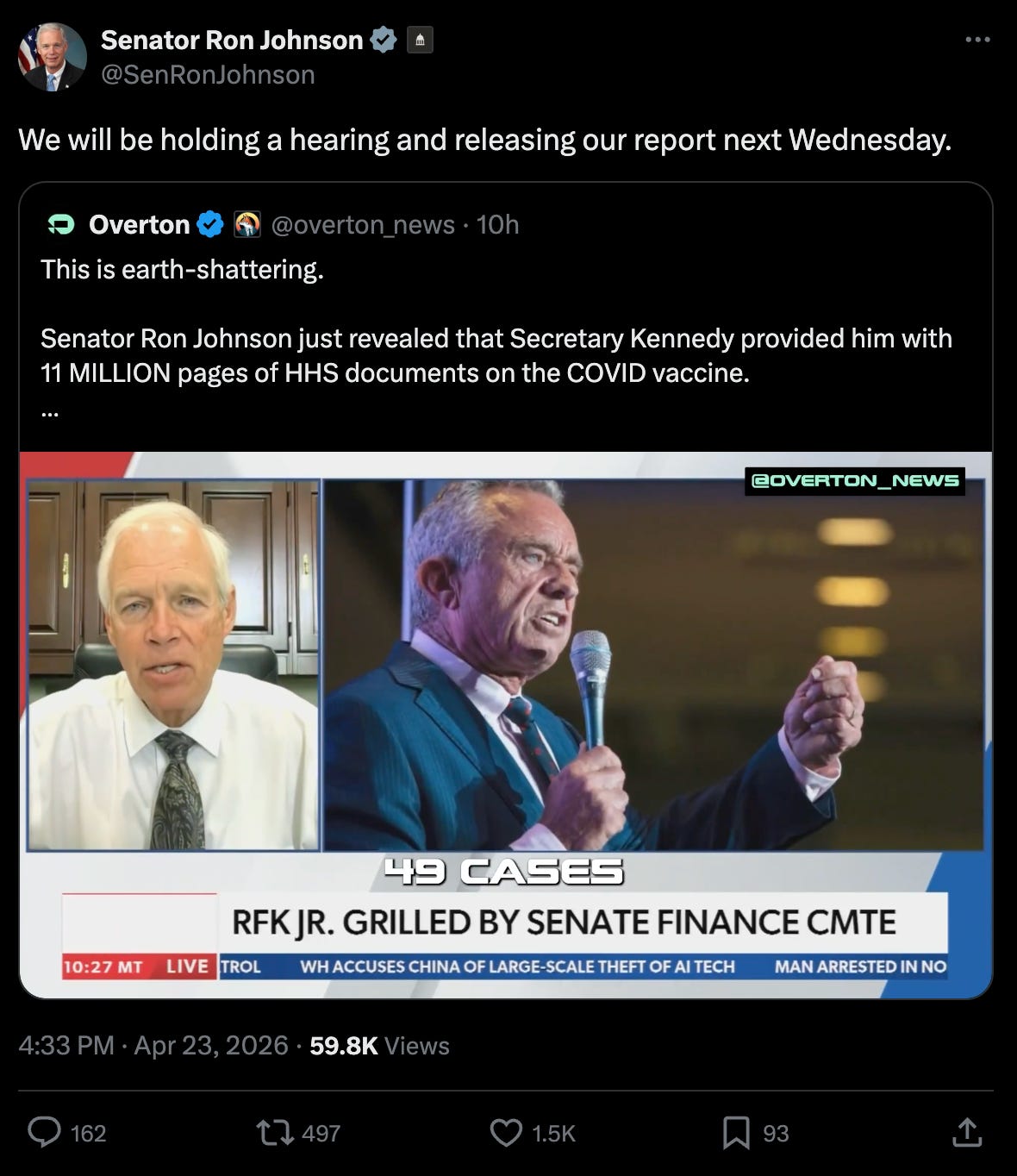 According to Senator Johnson, Kennedy handed over 11 million pages of internal HHS documents tied to the COVID vaccine — documents that were withheld for years under the Biden administration.